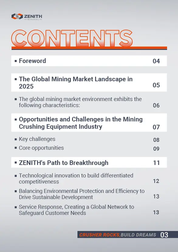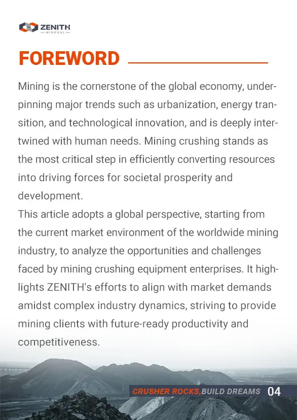 This article adopts a global perspective, starting from the current market environment of the worldwide mining industry, to analyze the opportunities and challenges faced by mining crushing equipment enterprises. It highlights ZENITH's efforts to align with market demands amidst complex industry dynamics, striving to provide mining clients with future-ready productivity and competitiveness.