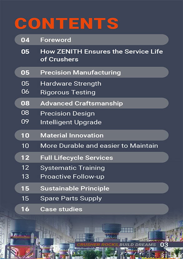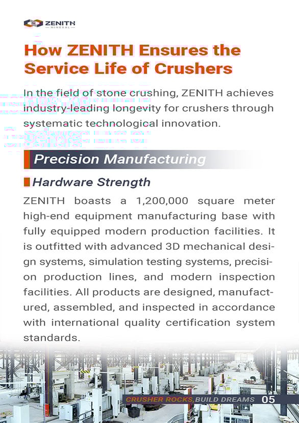 In the aggregate and metal ore processing industries, the service life of equipment directly impacts production continuity, operating costs, and return on investment. This e-book takes ZENITH crushers as an example, providing an in-depth analysis of why ZENITH crushers achieve exceptionally long service life, supported by numerous successful project cases. Through this article, it offers multifaceted reference points for customers when selecting crushers, helping them better choose crushing equipment that meets their production needs.