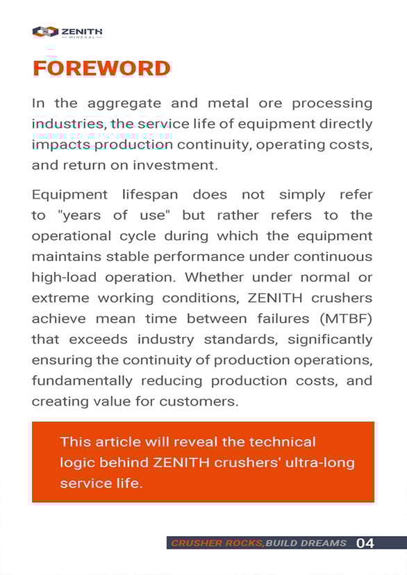 In the aggregate and metal ore processing industries, the service life of equipment directly impacts production continuity, operating costs, and return on investment. This e-book takes ZENITH crushers as an example, providing an in-depth analysis of why ZENITH crushers achieve exceptionally long service life, supported by numerous successful project cases. Through this article, it offers multifaceted reference points for customers when selecting crushers, helping them better choose crushing equipment that meets their production needs.