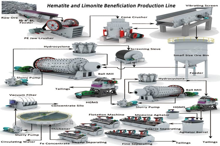 Hematite and limonite beneficiation production line integrates crushing, grinding, classification, magnetic separation, flotation, and dewatering.